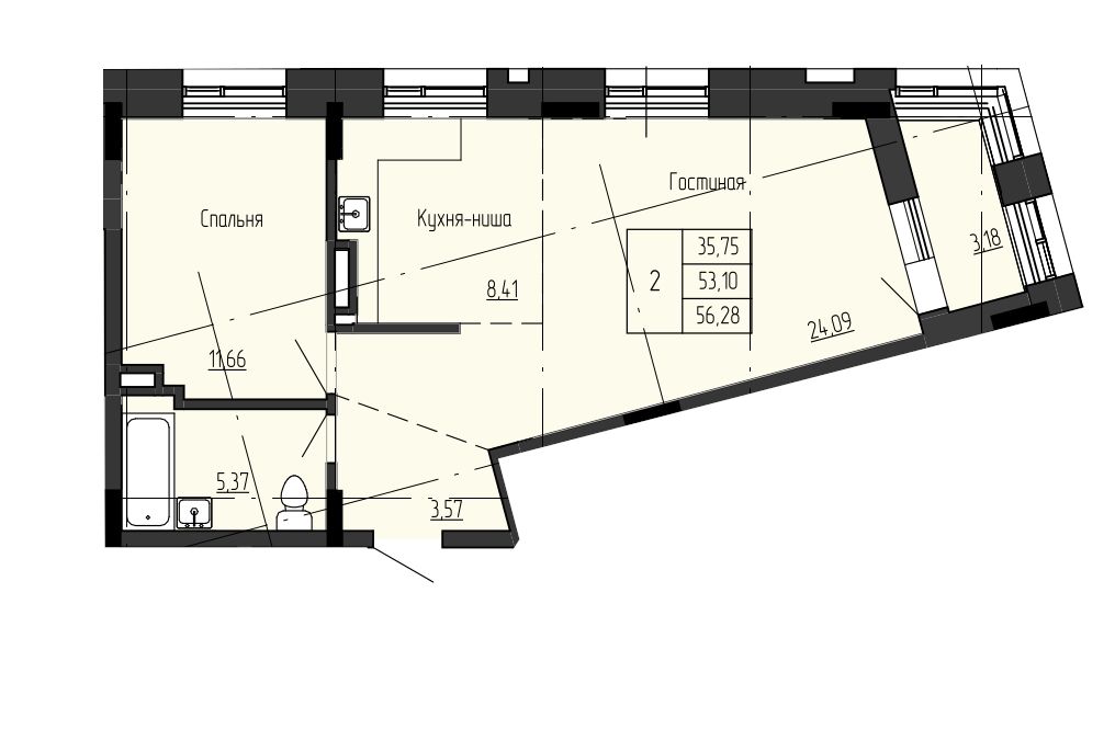 2-комн. 56,28 м² ・ № 156 ・ этаж 6/16 ・ ЖК Текта вью