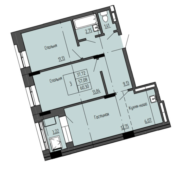 3-комн. 60,38 м² ・ № 234 ・ этаж 14/16 ・ ЖК Текта вью