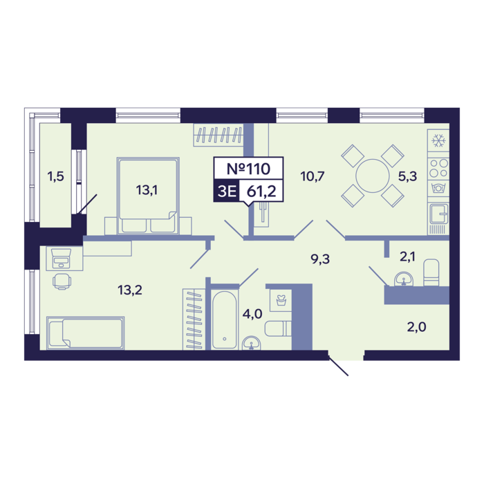 3-комн. 61,20 м² ・ № 110 ・ этаж 15/16 ・ ЖК "Ленские высоты", корп. 1