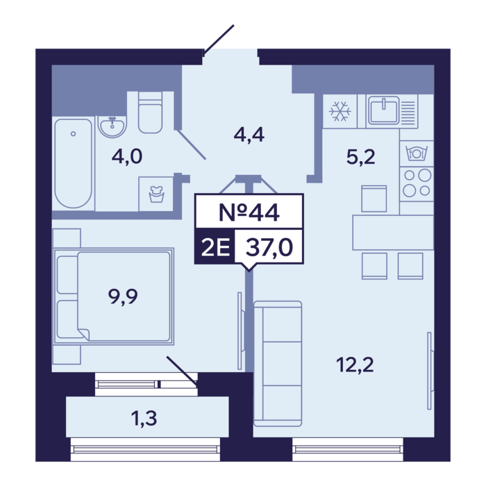 2-комн. 37,00 м² ・ № 44 ・ этаж 7/16 ・ ЖК "Ленские высоты", корп. 1
