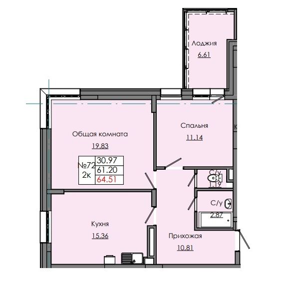2-комн. 64,51 м² ・ № 72 ・ этаж 8/8 ・ Звездный С1А