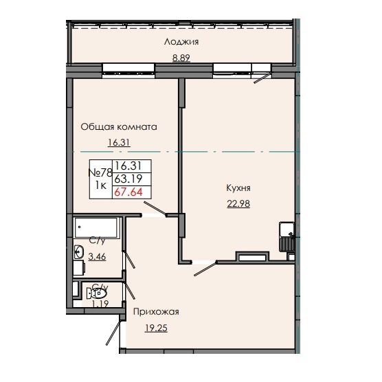 1-комн. 67,64 м² ・ № 78 ・ этаж 8/8 ・ Звездный С1А