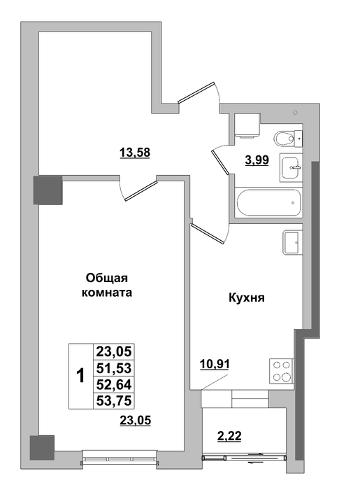 1-комн. 52,64 м² ・ № 1 ・ этаж 1/16 ・ ЖК Алгыс 3 этап