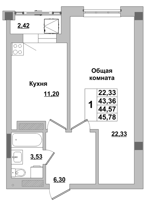 1-комн. 44,57 м² ・ № 211 ・ этаж 14/16 ・ ЖК Алгыс 3 этап