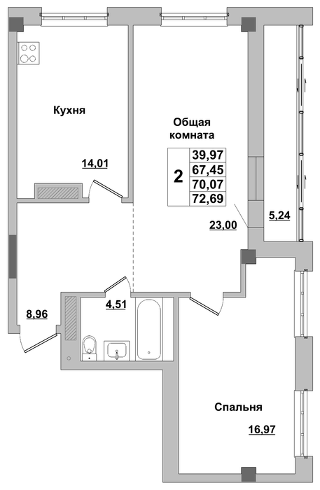 2-комн. 70,07 м² ・ № 320 ・ этаж 14/16 ・ ЖК Алгыс 3 этап