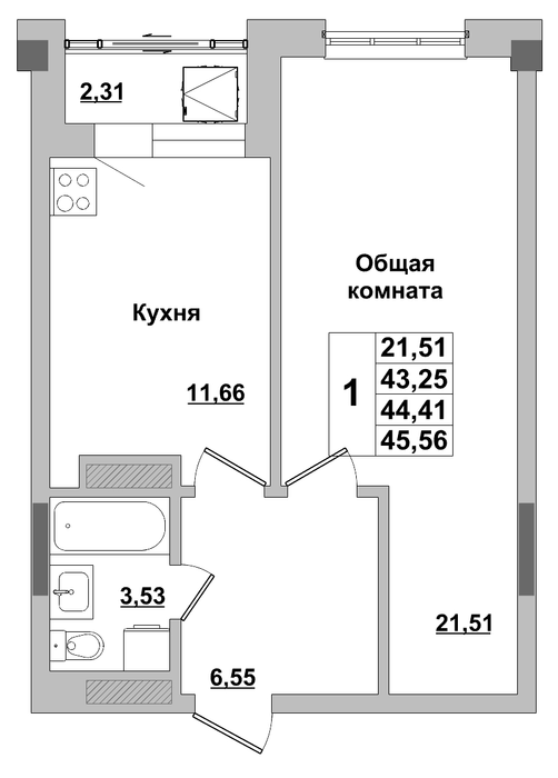 1-комн. 44,41 м² ・ № 93 ・ этаж 13/16 ・ ЖК Алгыс 3 этап