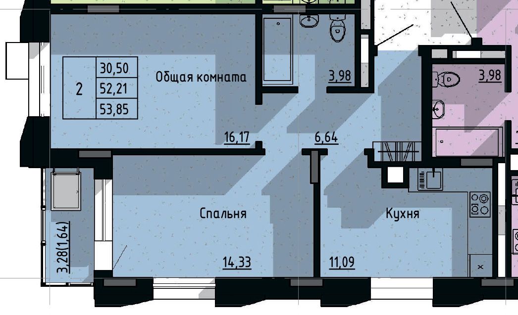2-комн. 53,85 м² ・ № 56 ・ этаж 9/16 ・ ЖК Сосновый бор