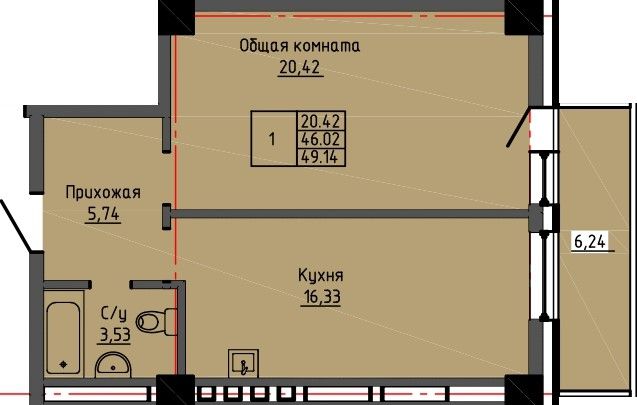 1-комн. 49,14 м² ・ № 100 ・ этаж 13/16 ・ ЖК Династия Парк, корп. 3, 2 этап