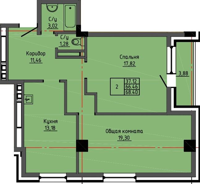 2-комн. 73 м² ・ № 4 ・ этаж 1/16 ・ ЖК Династия Парк, корп. 3, 2 этап