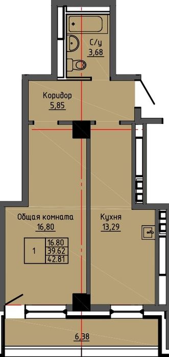 1-комн. 42,81 м² ・ № 76 ・ этаж 10/16 ・ ЖК Династия Парк, корп. 3, 2 этап