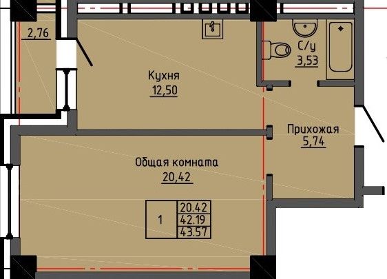 1-комн. 43,57 м² ・ № 96 ・ этаж 12/16 ・ ЖК Династия Парк, корп. 3, 2 этап