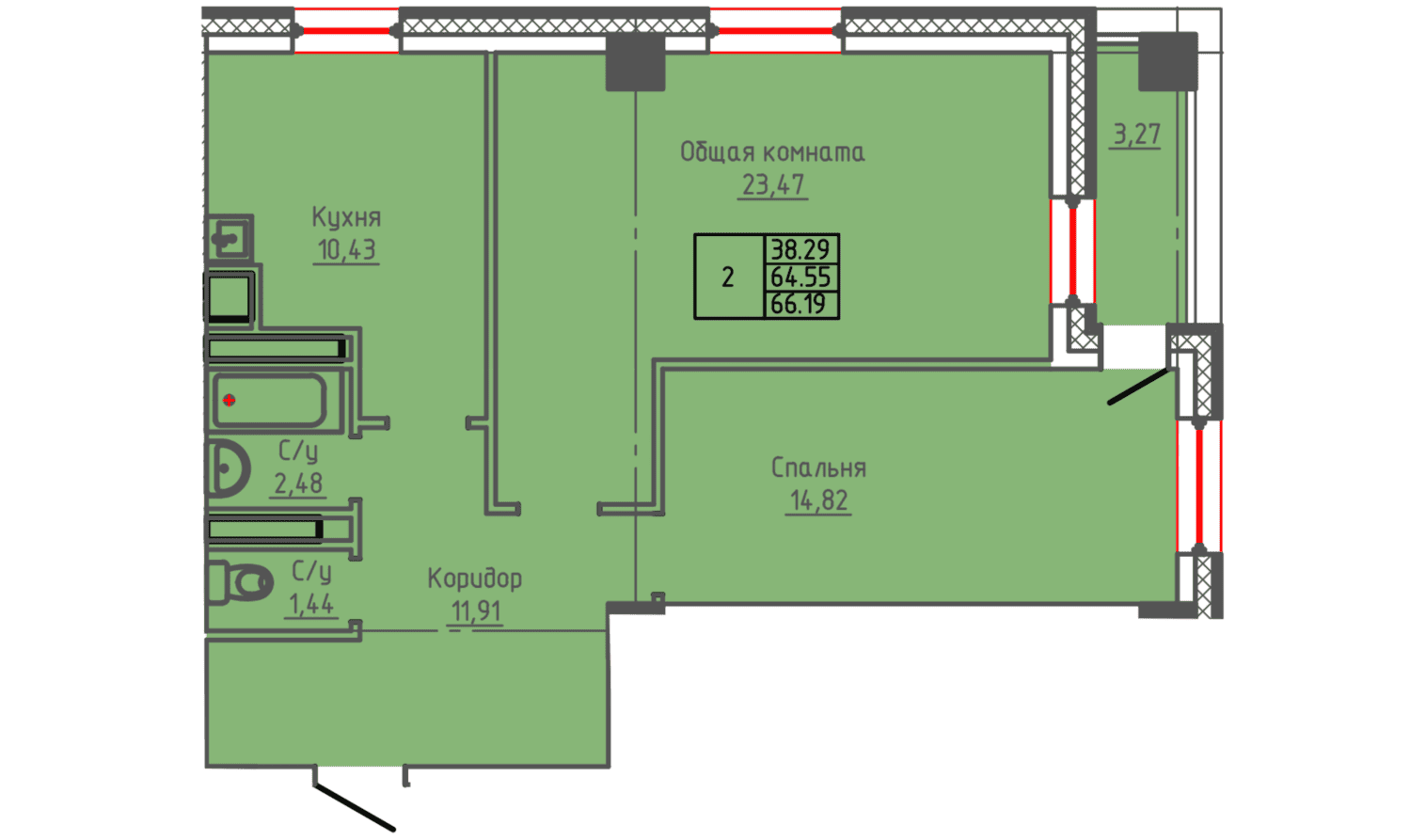 2-комн. 66,19 м² ・ № 77 ・ этаж 10/16 ・ ЖК Династия Парк, корп. 4, 1 этап