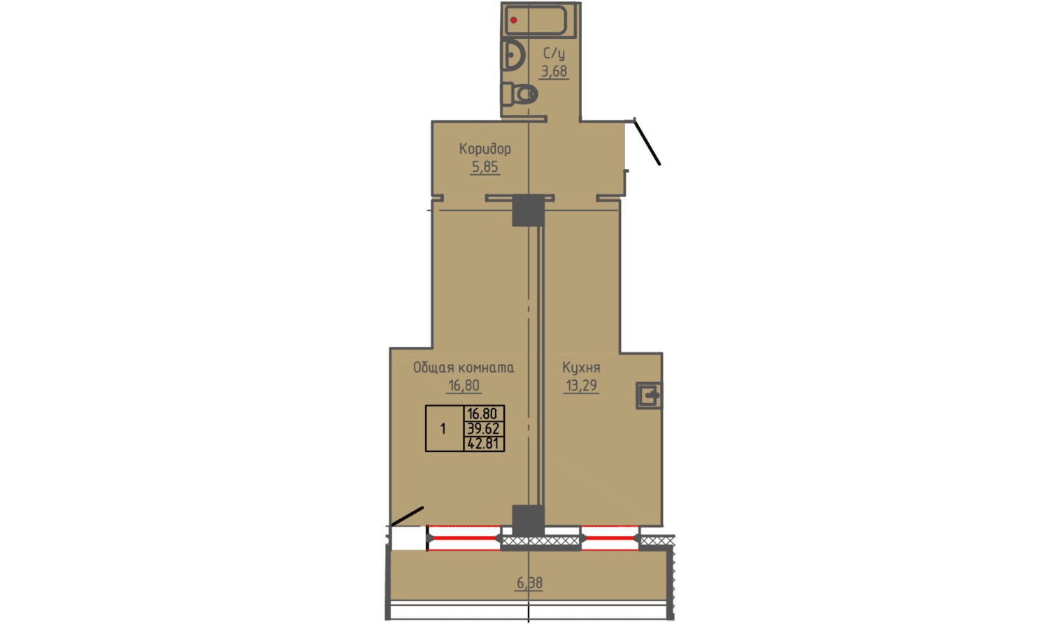 1-комн. 42,81 м² ・ № 9 ・ этаж 2/16 ・ ЖК Династия Парк, корп. 4, 1 этап