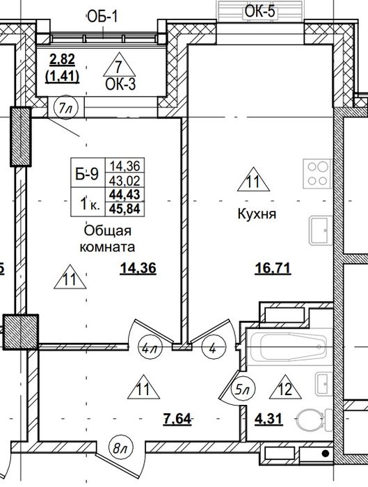 1-комн. 44,43 м² ・ № 160 ・ этаж 4/16 ・ ЖК Город в Парке, блок Б