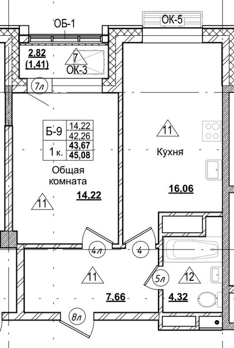 1-комн. 43,67 м² ・ № 232 ・ этаж 12/16 ・ ЖК Город в Парке, блок Б