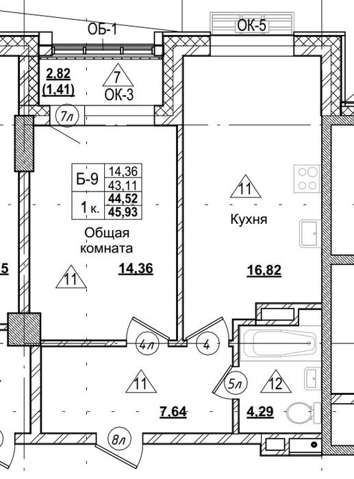 1-комн. 44,52 м² ・ № 151 ・ этаж 3/16 ・ ЖК Город в Парке, блок А
