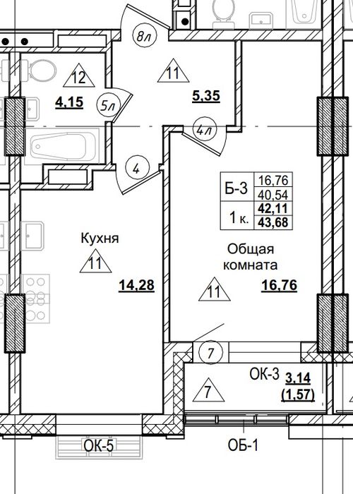 1-комн. 42,11 м² ・ № 154 ・ этаж 4/16 ・ ЖК Город в Парке, блок А