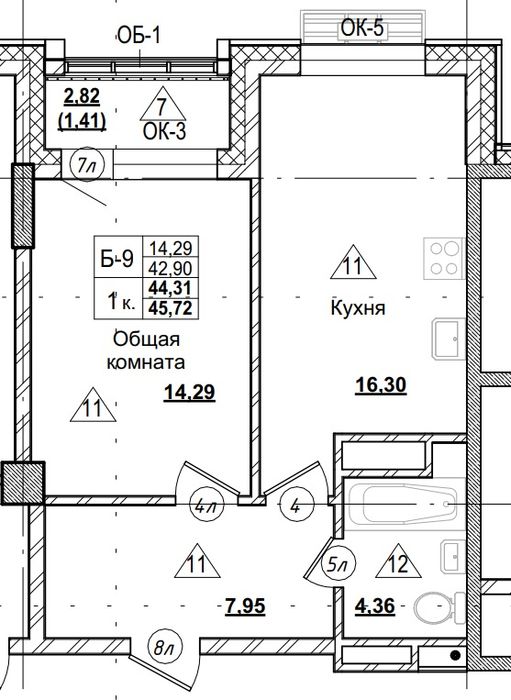 1-комн. 44,31 м² ・ № 169 ・ этаж 5/16 ・ ЖК Город в Парке, блок А