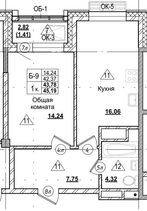 1-комн. 43,78 м² ・ № 241 ・ этаж 13/16 ・ ЖК Город в Парке, блок А