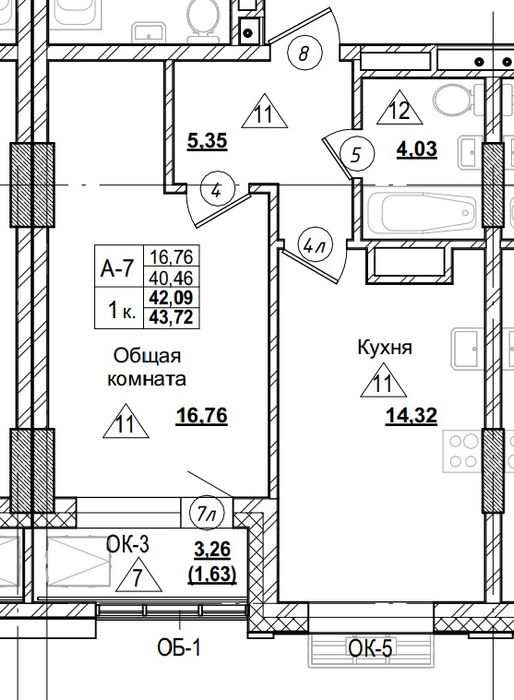 1-комн. 42,09 м² ・ № 59 ・ этаж 8/16 ・ ЖК Город в Парке, блок А