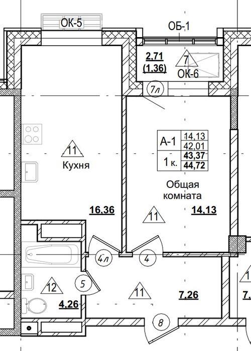 1-комн. 43,37 м² ・ № 89 ・ этаж 12/16 ・ ЖК Город в Парке, блок А