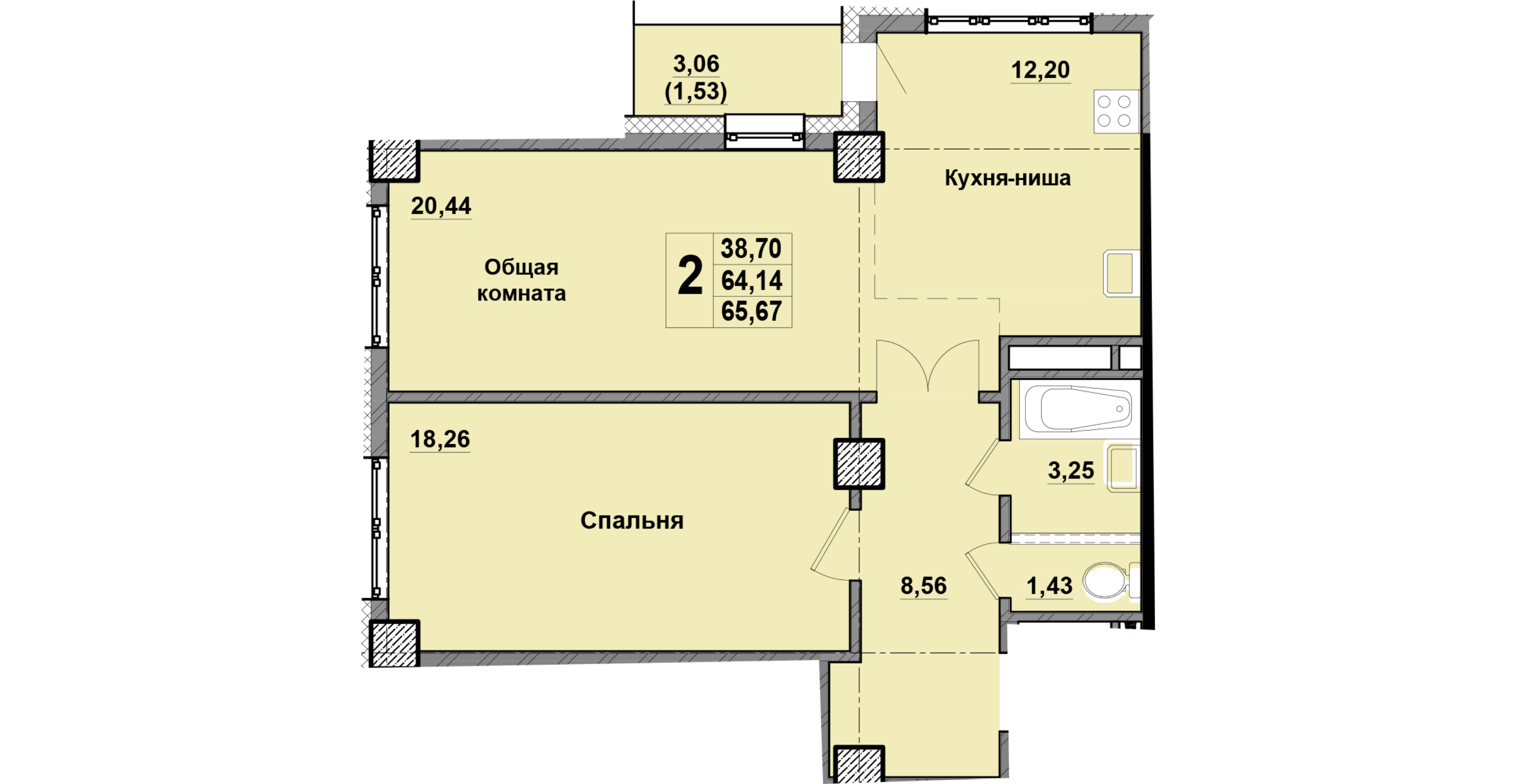 2-комн. 65,67 м² ・ № 14 ・ этаж 5/16 ・ ЖК Крепость