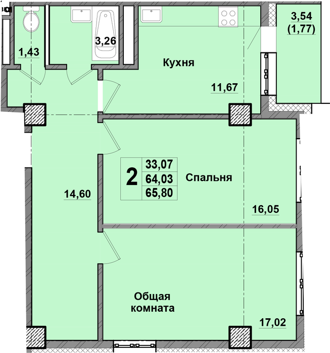 2-комн. 65,8 м² ・ № 3 ・ этаж 4/16 ・ ЖК Крепость