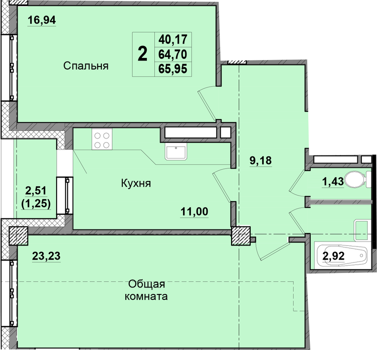 2-комн. 65,95 м² ・ № 48 ・ этаж 10/16 ・ ЖК Крепость