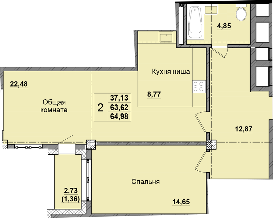 2-комн. 64,98 м² ・ № 68 ・ этаж 13/16 ・ ЖК Крепость