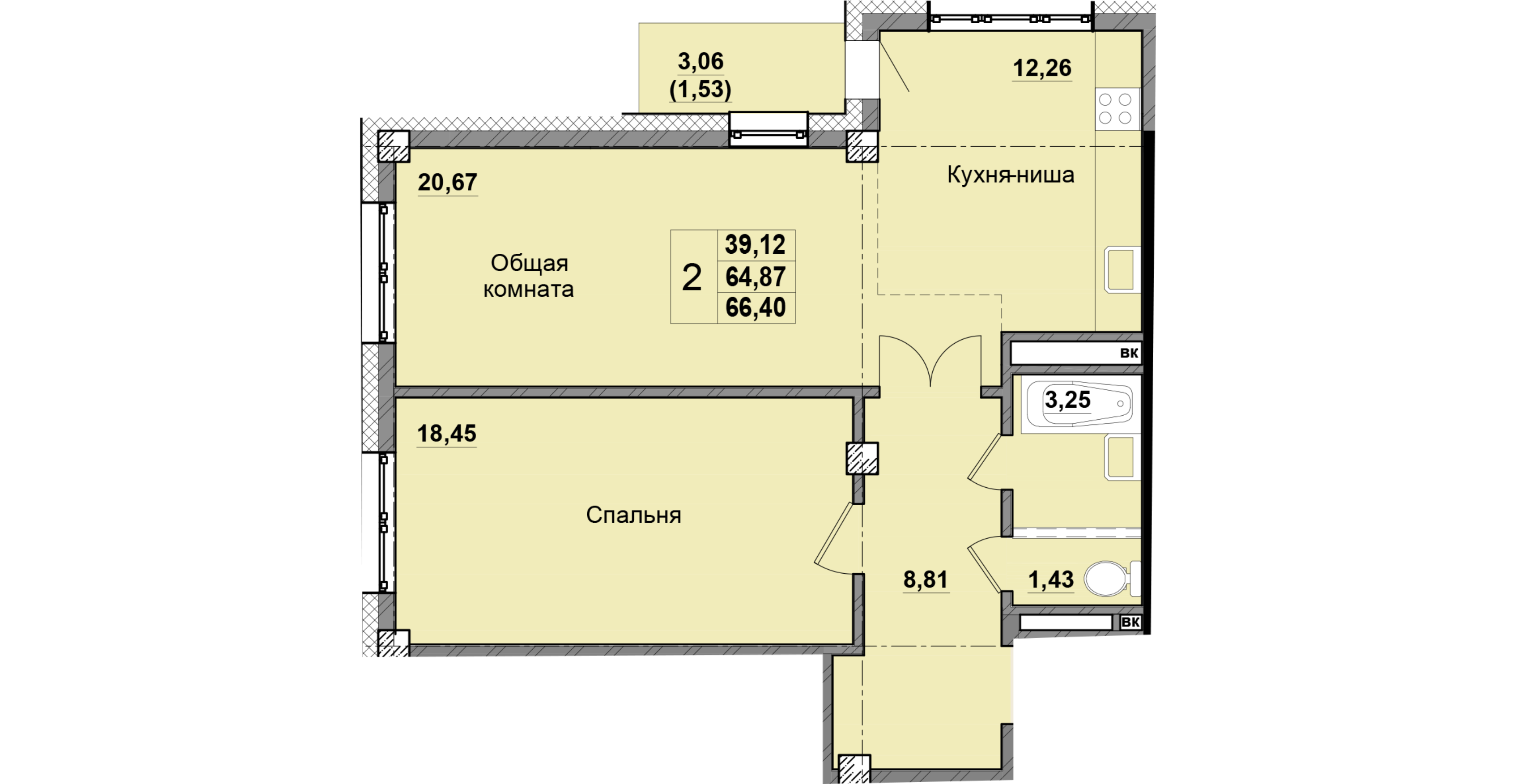 2-комн. 66,4 м² ・ № 84 ・ этаж 15/16 ・ ЖК Крепость