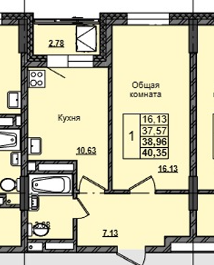 1-комн. 38,96 м² ・ № 128 ・ этаж 11/16 ・ ЖК Прайм