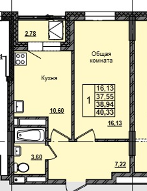 1-комн. 38,94 м² ・ № 130 ・ этаж 12/16 ・ ЖК Прайм